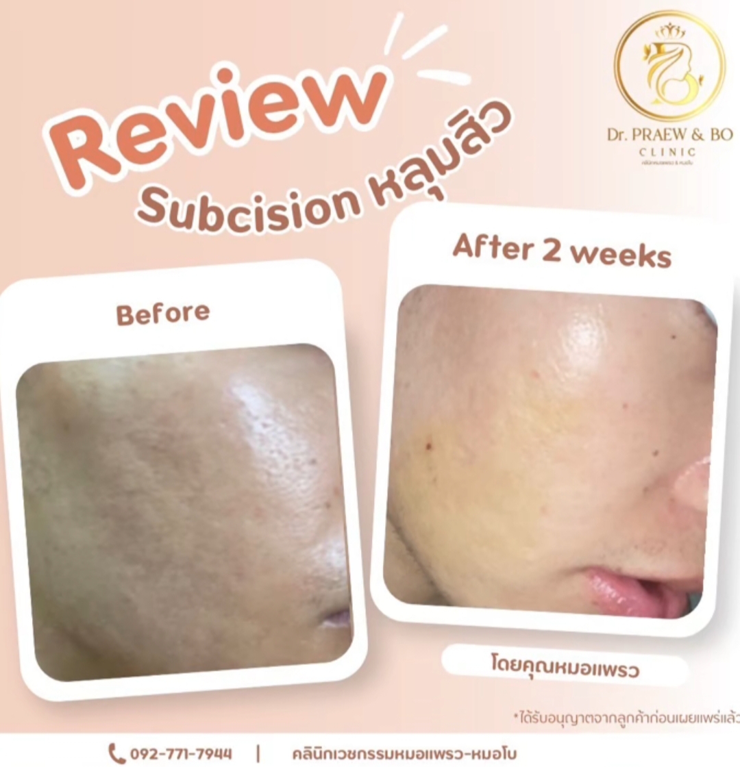 Review Subcision หลุมสิว เปรียบเทียบก่อนทำ บริเวณแก้มผิวหน้าไม่เรียบเนียนมีหลุมสิว และหลังทำไป 2 สัปดาห์ ผลลัพธ์ผิวหน้าเรียบเนียนขึ้น หลุมสิวตื้นขึ้นชัดเจน จึ้งมากสวยมากก คลินิกเวชกรรม หมอแพรว-หมอโบ คลินิกเสริมความงาม นครศรีธรรมราช