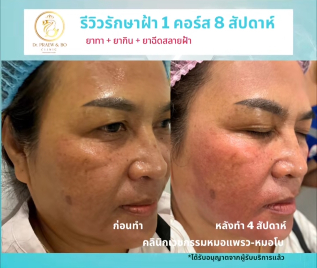 รีวิวรักษาฝ้า 1 คอร์ส 8 สัปดาห์ ยาทา + ยากิน + ยาฉีดสลายฝ้า เปรียบเทียบก่อนทำ และหลังทำไป 4 สัปดาห์ ฝ้าจางลง หน้าขาวกระจ่างใสขึ้น คลินิกเวชกรรม หมอแพรว-หมอโบ คลินิกเสริมความงาม นครศรีธรรมราช
